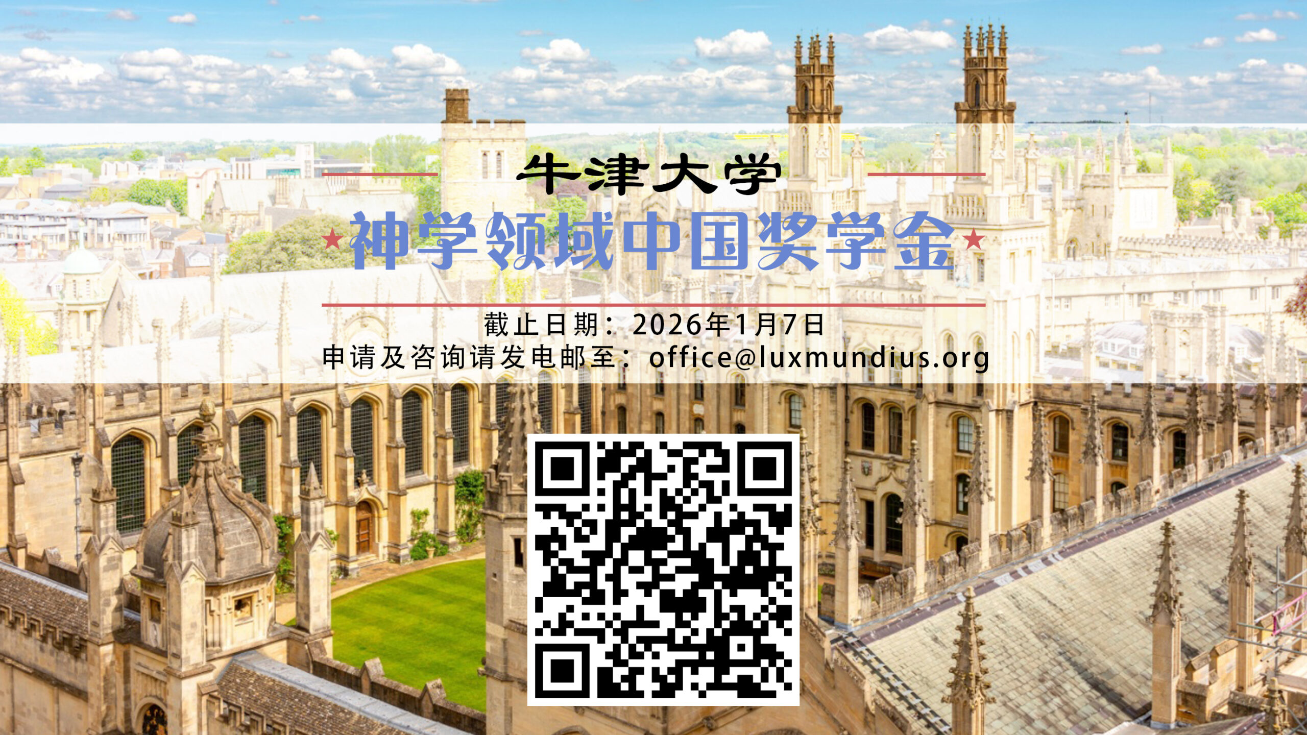现为2026年入学新生设立两项研究生奖学金:一项面向新约研究领域,一项面向系统神学或基督教神学其他领域。此类奖项旨在培养中国杰出学者于牛津大学攻读圣经与神学研究。
